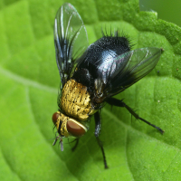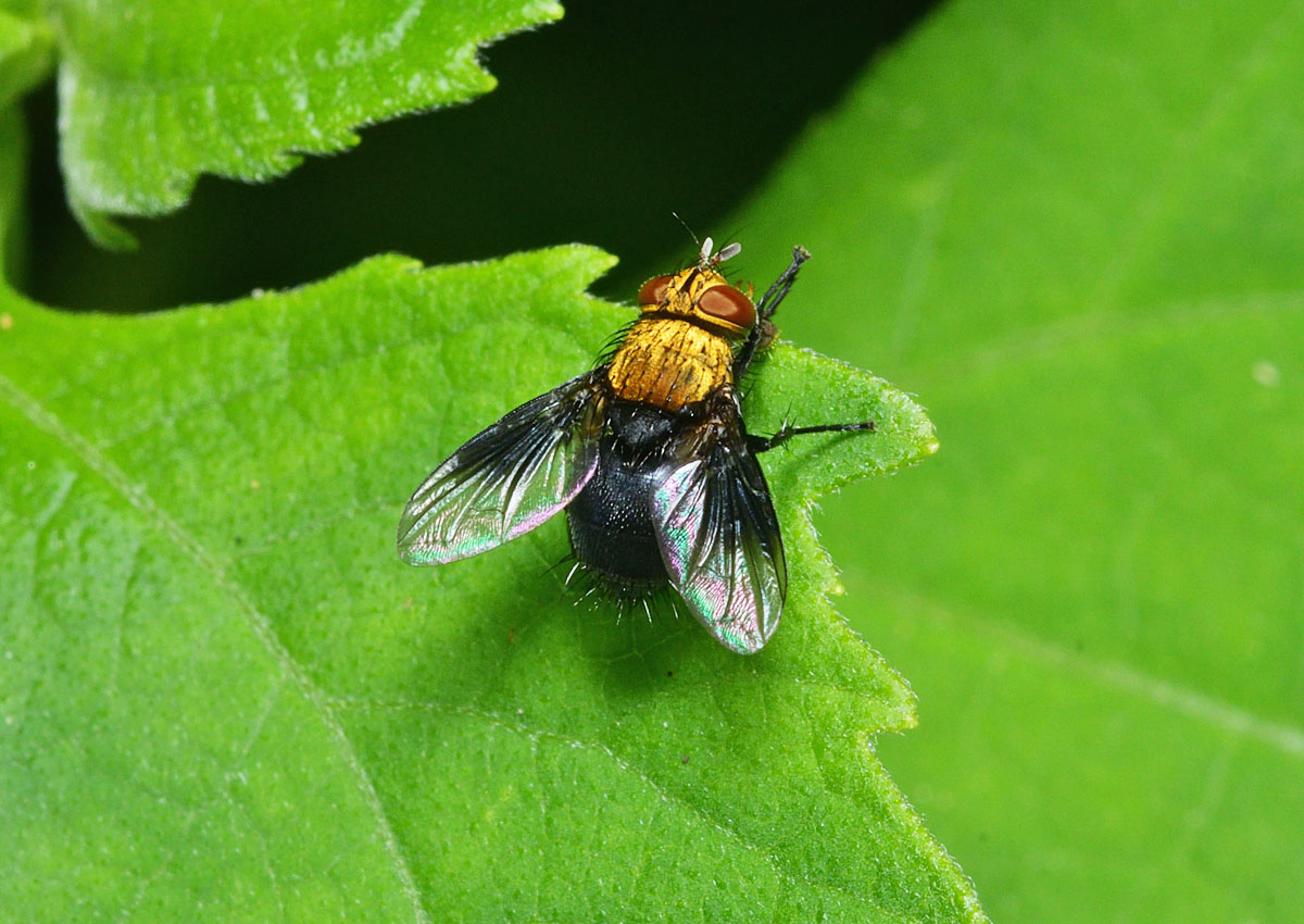 和名がまだ付けられていないヤドリバエの一種。 胸部は黄金色、腹部は黒色、複眼は茶色。