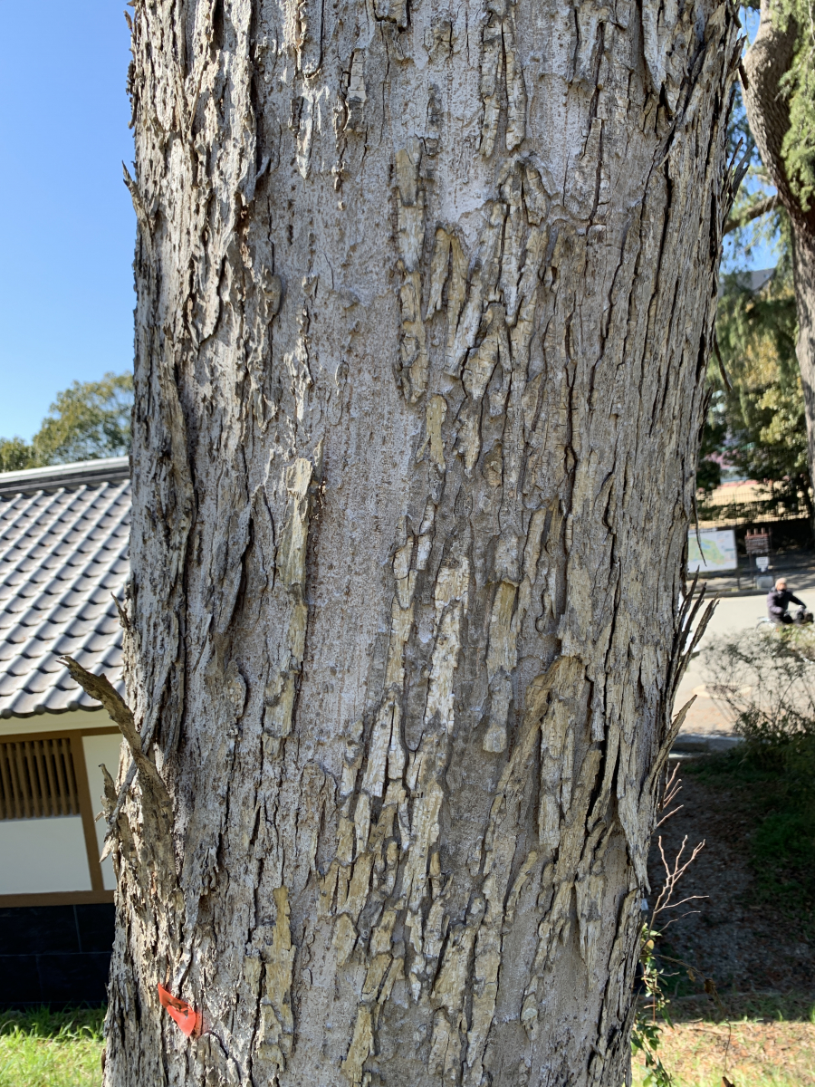 - 樹皮は灰褐色で平滑だが、老木になると樹皮がはがれる。