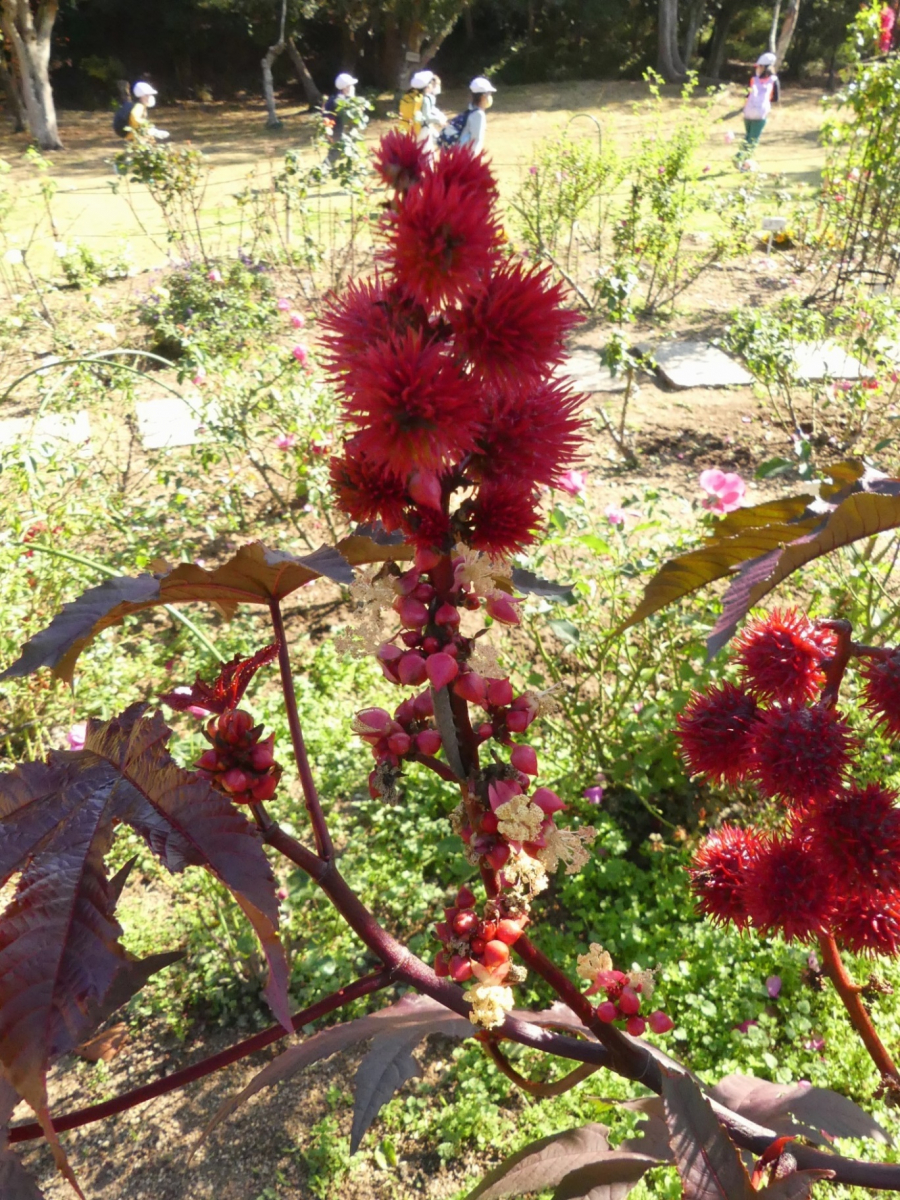 先端の赤くて丸いトゲトゲが雌花、下の白い色のものが雄花です。