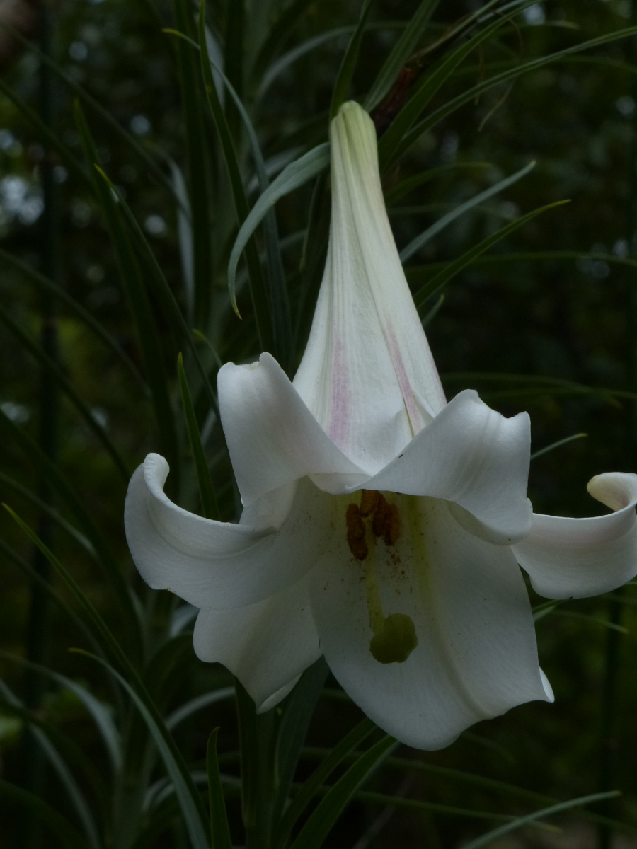 テッポウユリとタカサゴユリの交配園芸種をシンテッポウユリと呼んでいるそうだけれど、その後に交雑が繰り返されているようで確実な区別点は?? 花筒に残る赤紫の筋を区別点に上げる見解も多いがこれも??