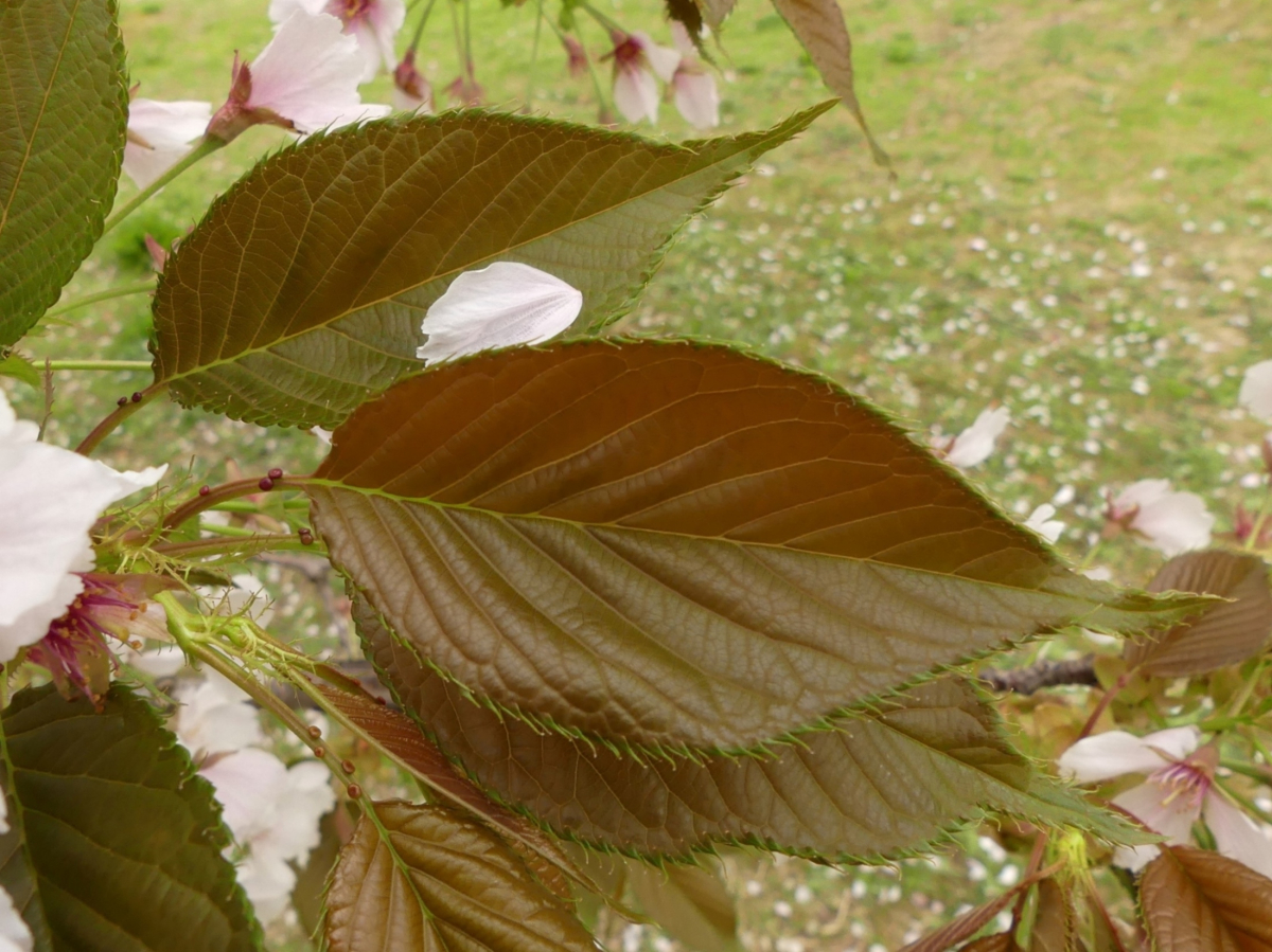 葉はオオシマザクラとよく似ているが、鋸歯はほぼ上向きでオオシマザクラと違って開かない。