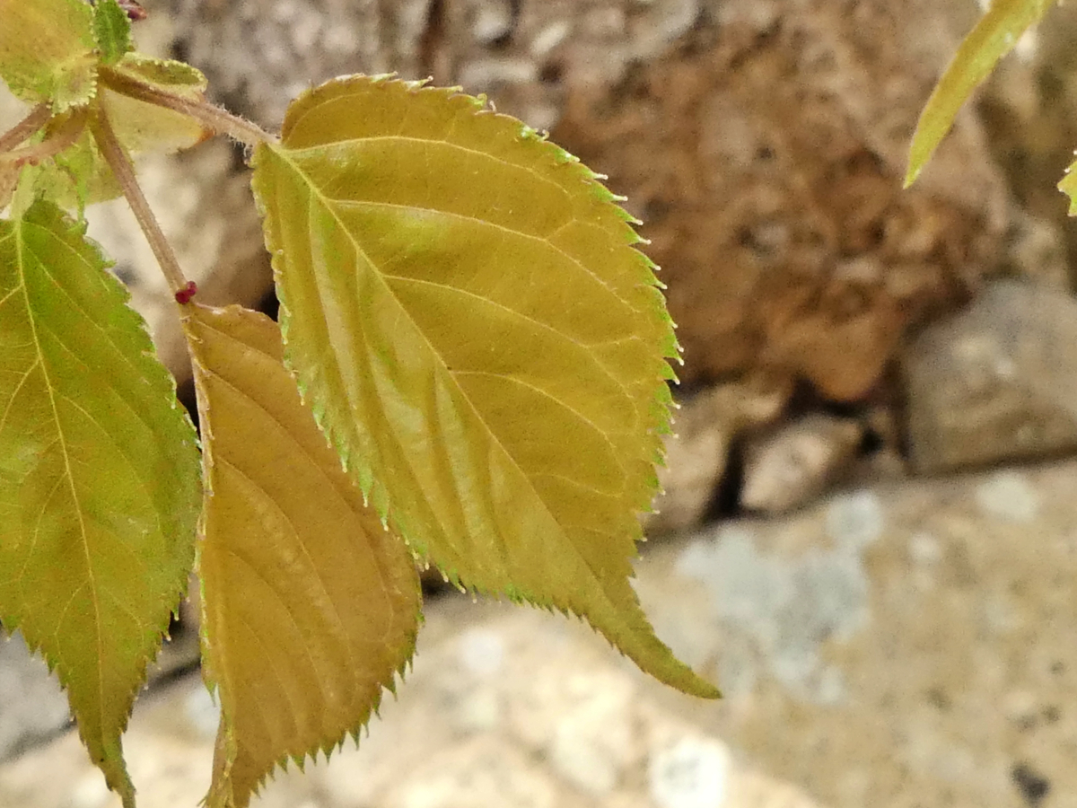 天守台の東側石垣 よく似たカスミザクラとは葉の鋸歯の形が異なる 鋸歯が葉の上向きに伏せ、鋸歯の先端がやや伸びる