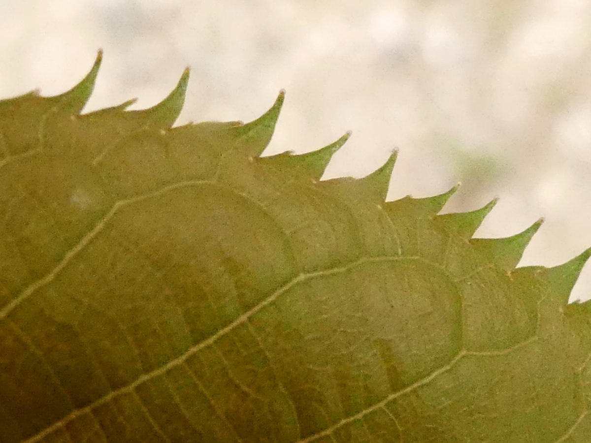 西テニスコート北側入口の東奥に植えられているもの。 鋸歯が外向きに開き、鋸歯の先端はあまり伸びない。