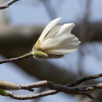 葉が開く前に、直径7~10cmの香りのよい白い花を咲かせる。花の下に小型の葉がある。