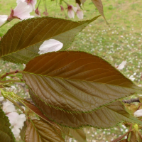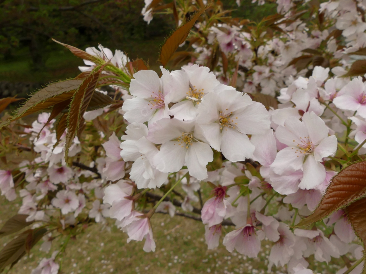 白色で花弁が少ない桜としては珍しく遅咲きで、濃い茶色の若葉が目立つ。