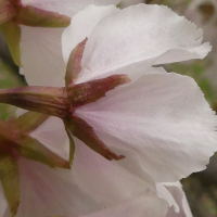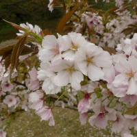一重咲きの花と半八重咲の花が混ざって咲く遅咲きの桜。