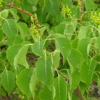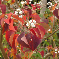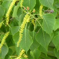 葉は三角状広卵形で先端は尾状、秋に美しく紅葉するので街路樹や公園に植えられることもある。