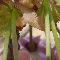 ガク筒は短いつり鐘形(ロート形)で、小花柄と共に無毛