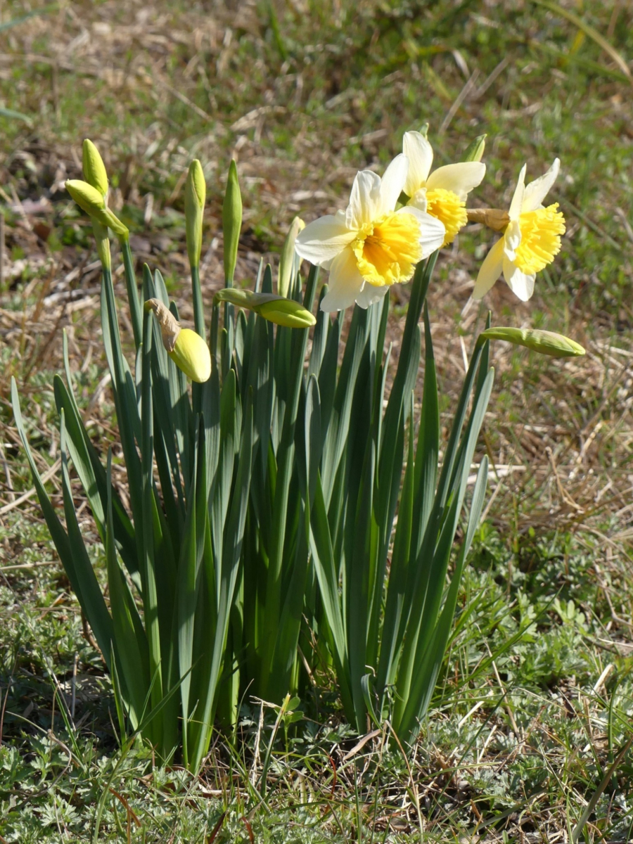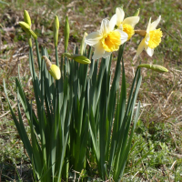 1花茎にひとつ花がつき、花被片は黄色で、内側の副花冠はやや色が濃く筒状で先はフレアー状に広がり、しわがある。