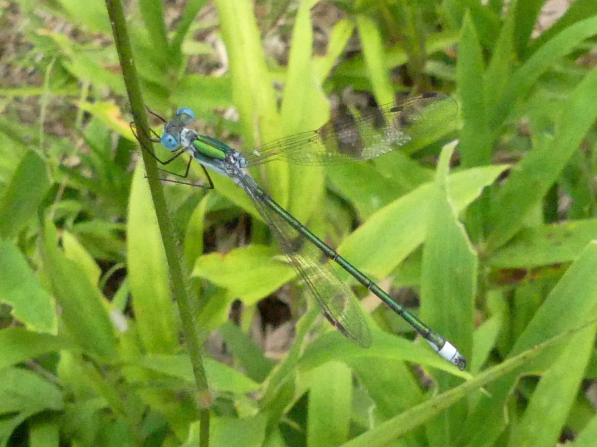 光沢のある青緑色のイトトンボ。オオアオイトトンボと似るが、本種の方がやや小さい。また、本種の成熟したオスは腹部第9節と第10節の2節が白いことや、胸部側面も白い粉を吹くことで見分けられる。