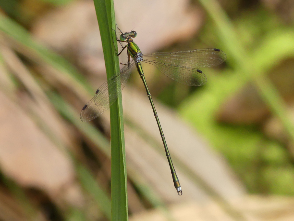 同じ科のアオイトトンボに似るが、本種の方がやや大きい。また、オスは尾の先の白い部分が、アオイトトンボが2節であるのに対し、本種は1節だけである。