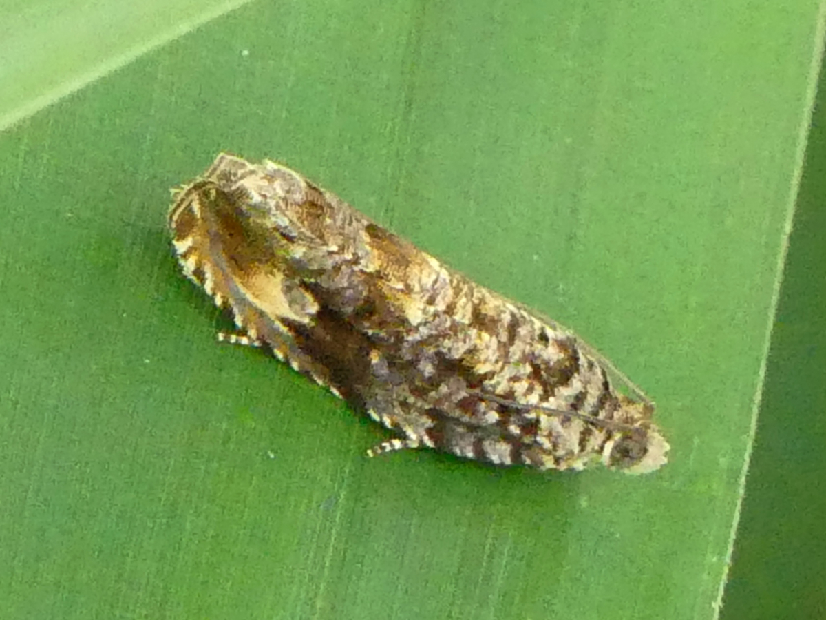 青みがかった灰色と暗褐色による細かい斑模様のヒメハマキ。