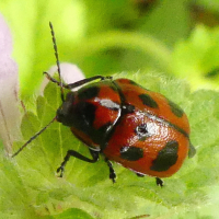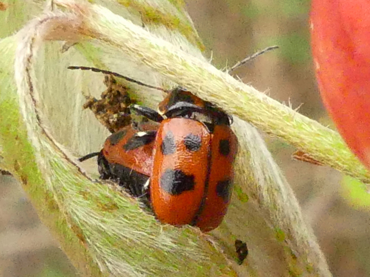 赤地に黒の斑紋で、ナナホシテントウと間違われることがある。