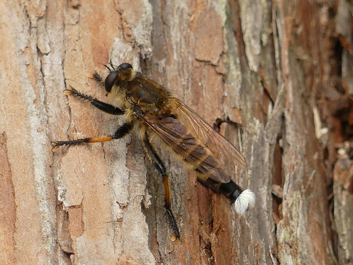 褐色の大きなムシヒキアブ。 全身に黄色の毛が生えており、腹部はこの毛によって黒ときいろの縞模様に見える。 オスは尾部に白い毛が生える。 肢はすねの部分だけが橙色で他は黒色。 成虫はコウチュウやハエ、アブなどを捕らえて体液を吸う。