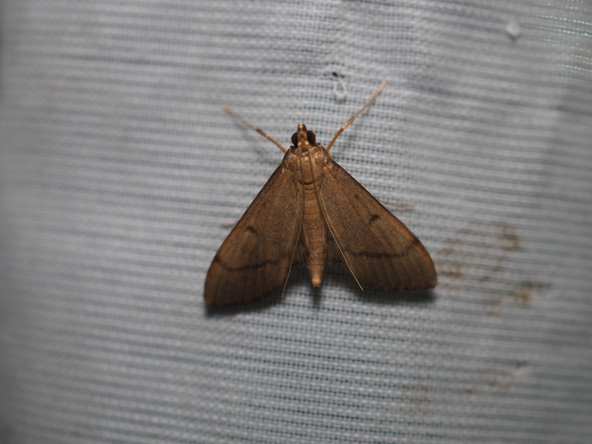 黒褐色の地色に細い黒色の線と前翅に小さな黒紋のある蛾。ノメイガ亜科 Bradina属の仲間はそれぞれよく似ており、見分けることが難しい。本種のオスは後翅の後縁(とまっているとき腹部に沿う部分)が表向きに膨らむので他の種と区別できる。