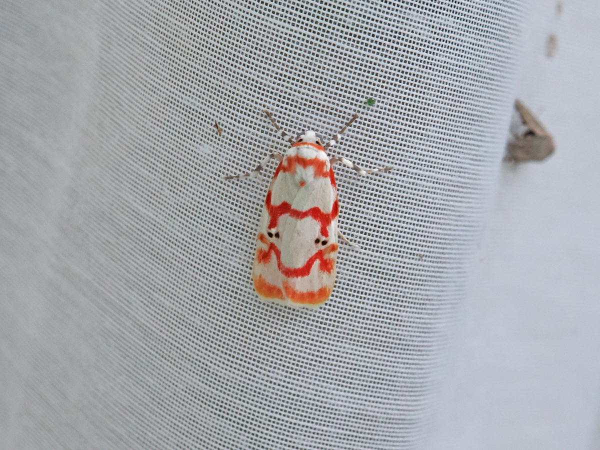 白地に赤の紋様が非常にきれいな蛾。オスとメスで、赤の紋様が少し異なる。