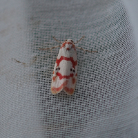 白地に赤の紋様が非常にきれいな蛾。オスとメスで、赤の紋様が少し異なる。 前翅の中央付近に黒点が1つまたは2つある。