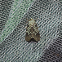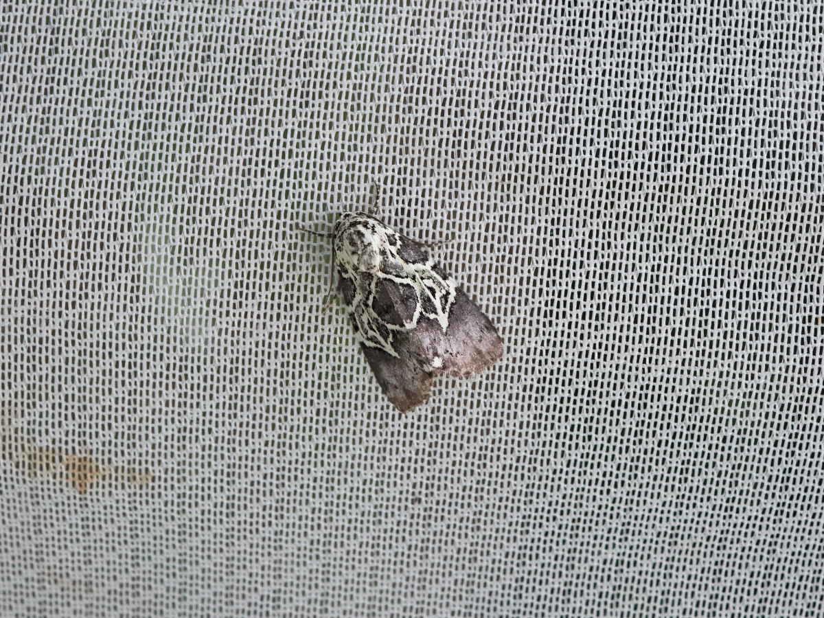 ヤガ科アミメケンモン亜科の蛾 紫がかった灰色地に、白の網目模様が入った翅をもつ。