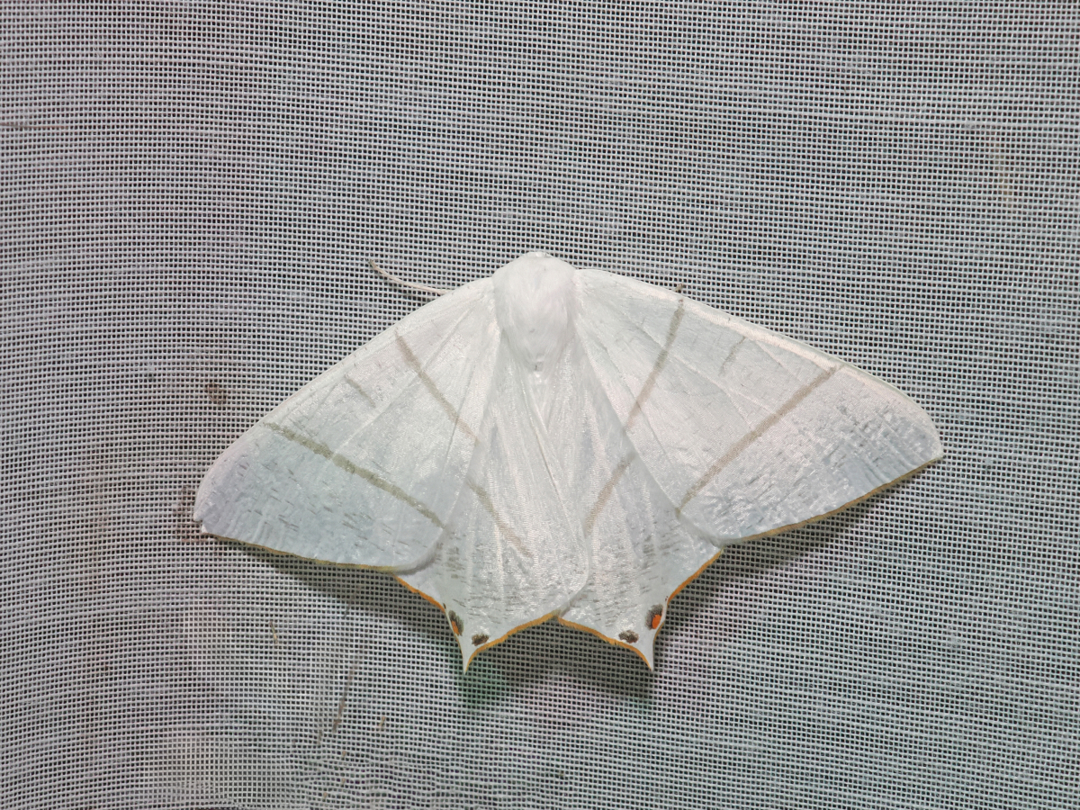 エダシャク亜科の仲間。 白色の翅で、淡褐色の横帯が、前翅に2本、後翅に1本ある。 同属のシロツバメエダシャクに酷似するが、本種は前翅2本の横帯の間にさざ波模様が入っていることや後翅の尾状突起がやや長いことで同定できる。