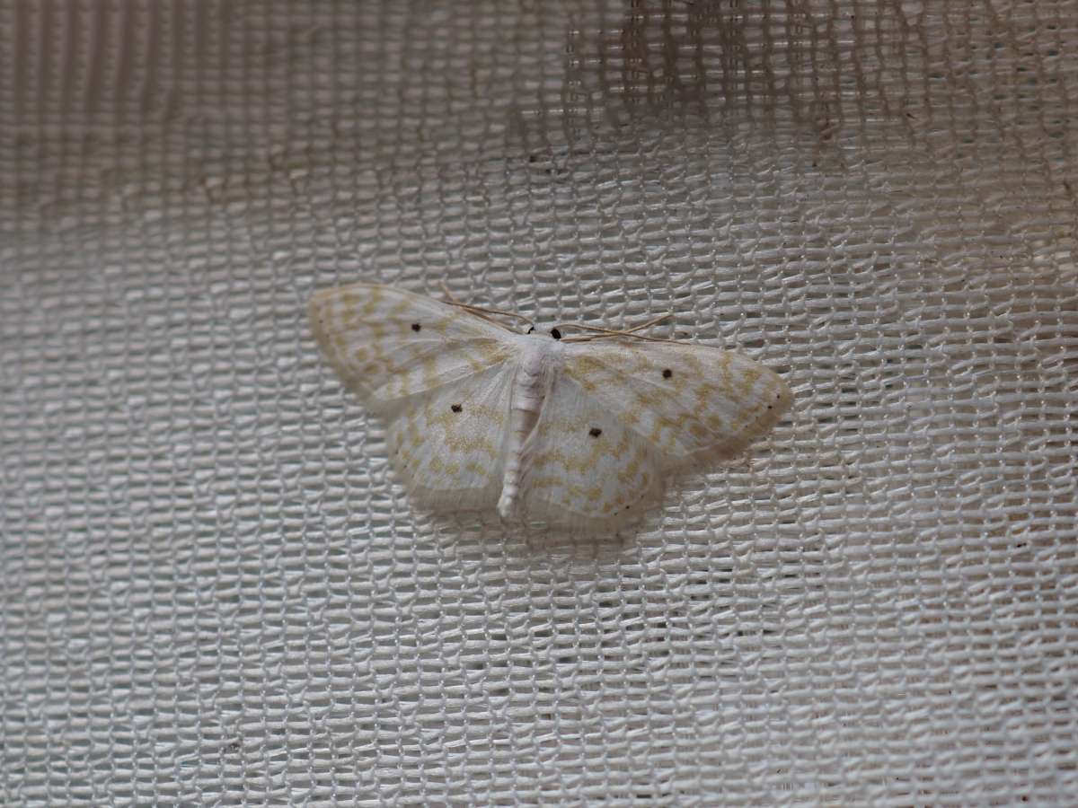 小型のヒメシャク。 翅の地色は白で、前翅、後翅それぞれに黄色の波打った横線が数本あり、明瞭な黒点が1つある。
