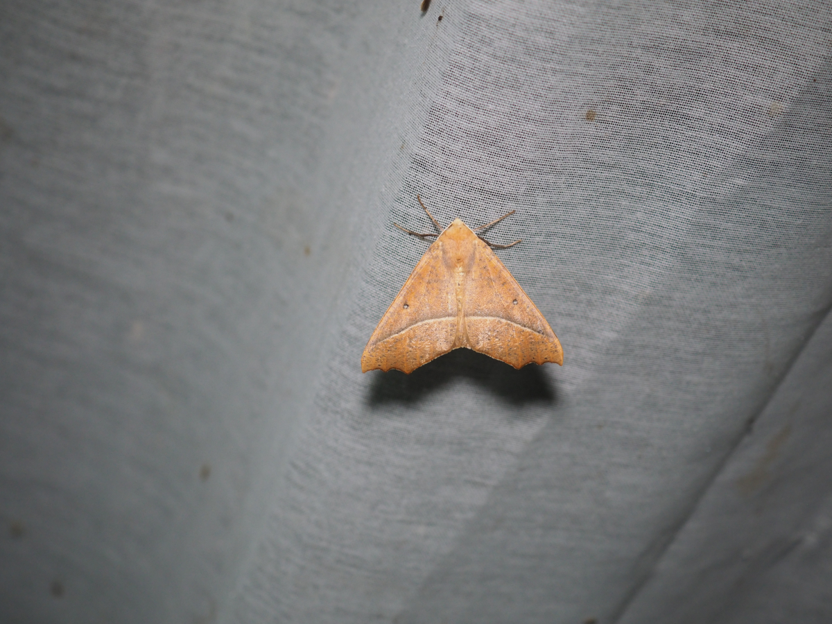 エダシャク亜科の一種。 前翅の地色は黄褐色から茶褐色まで個体差がある。 小さな紋が1対あり、外横線はくすんだ黒と白の細い直線。 前翅の外縁がえぐられたような形状をしている。
