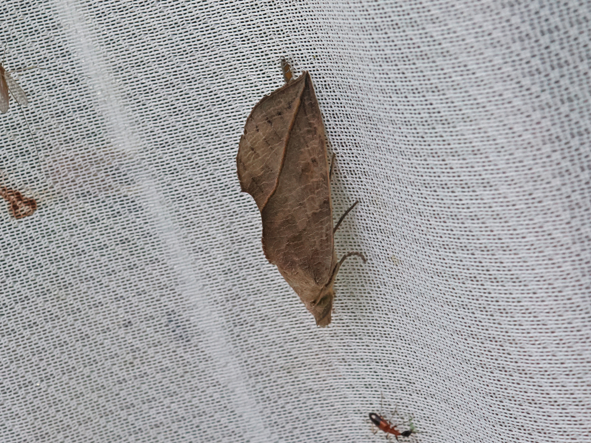 淡褐色で、まるで枯葉のように見える前翅を持った蛾。後翅もほぼ同じ色。頭部は突出している。