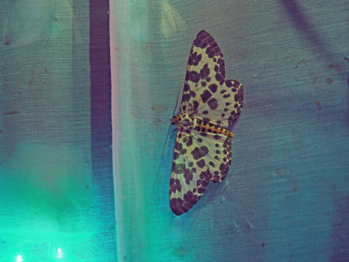 大型のエダシャク 白色の地に黒色の斑模様がある。 腹部は橙黄色で体節に沿った明瞭な黒紋がある。