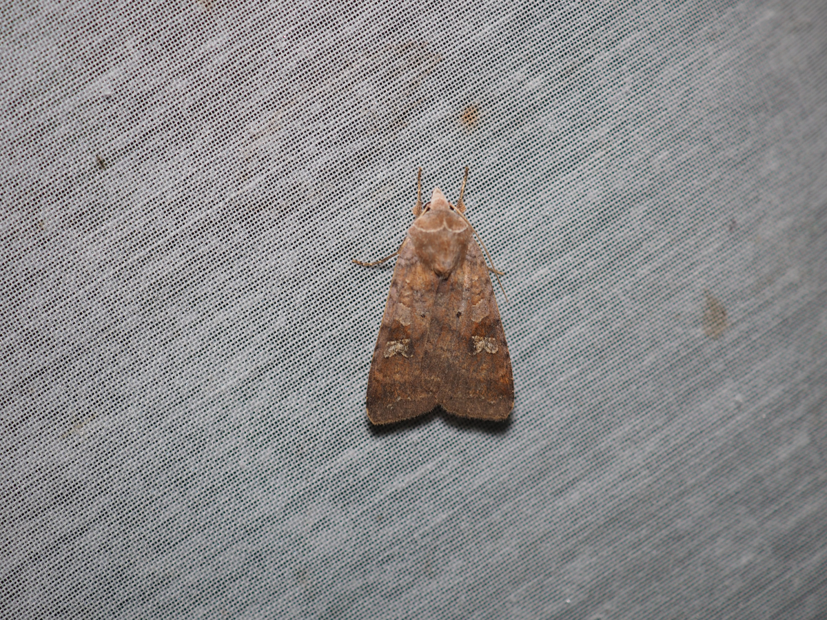明るい茶色のモンヤガ亜科の仲間。 同じ仲間のコウスチャヤガに似るので、同定には注意が必要。