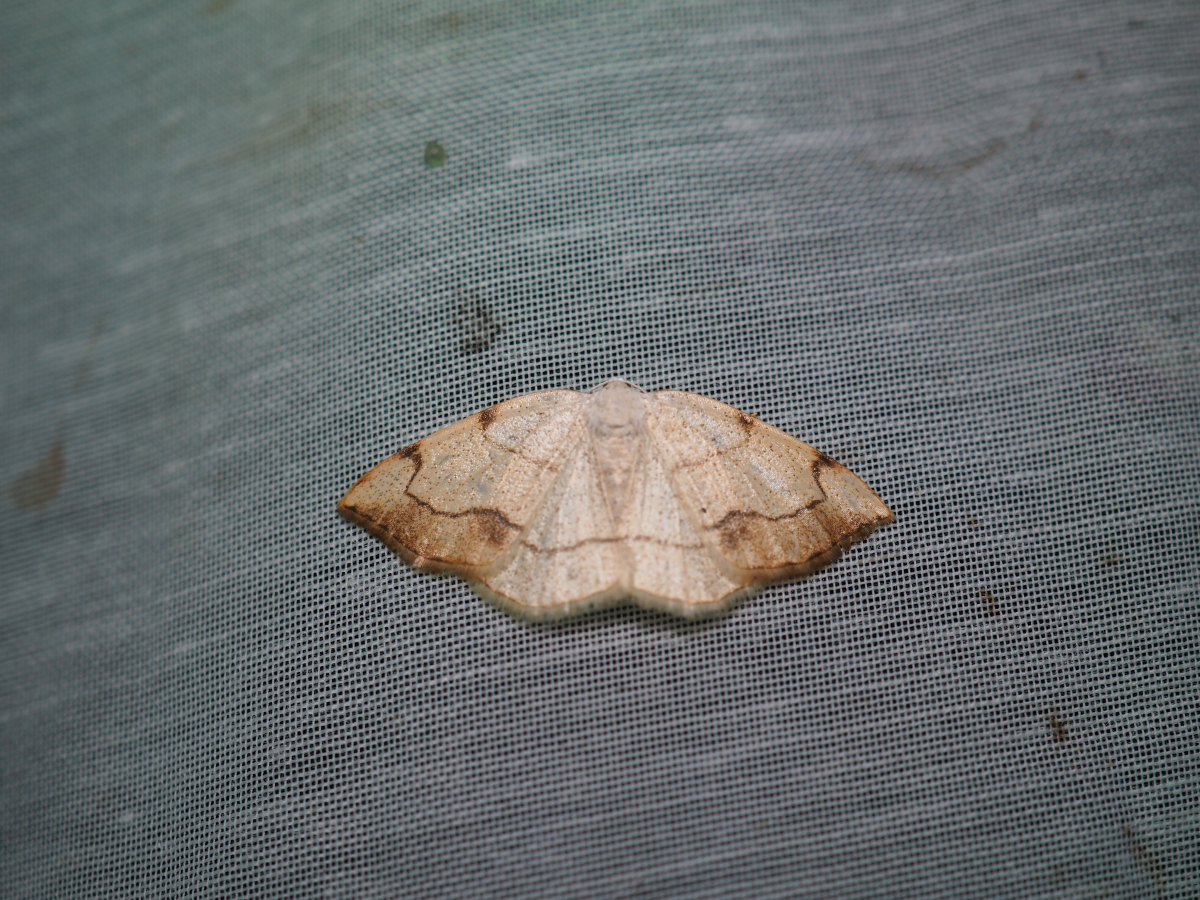 2本の横線による模様が特徴のエダシャク。 前翅の外横線の外側は褐色。