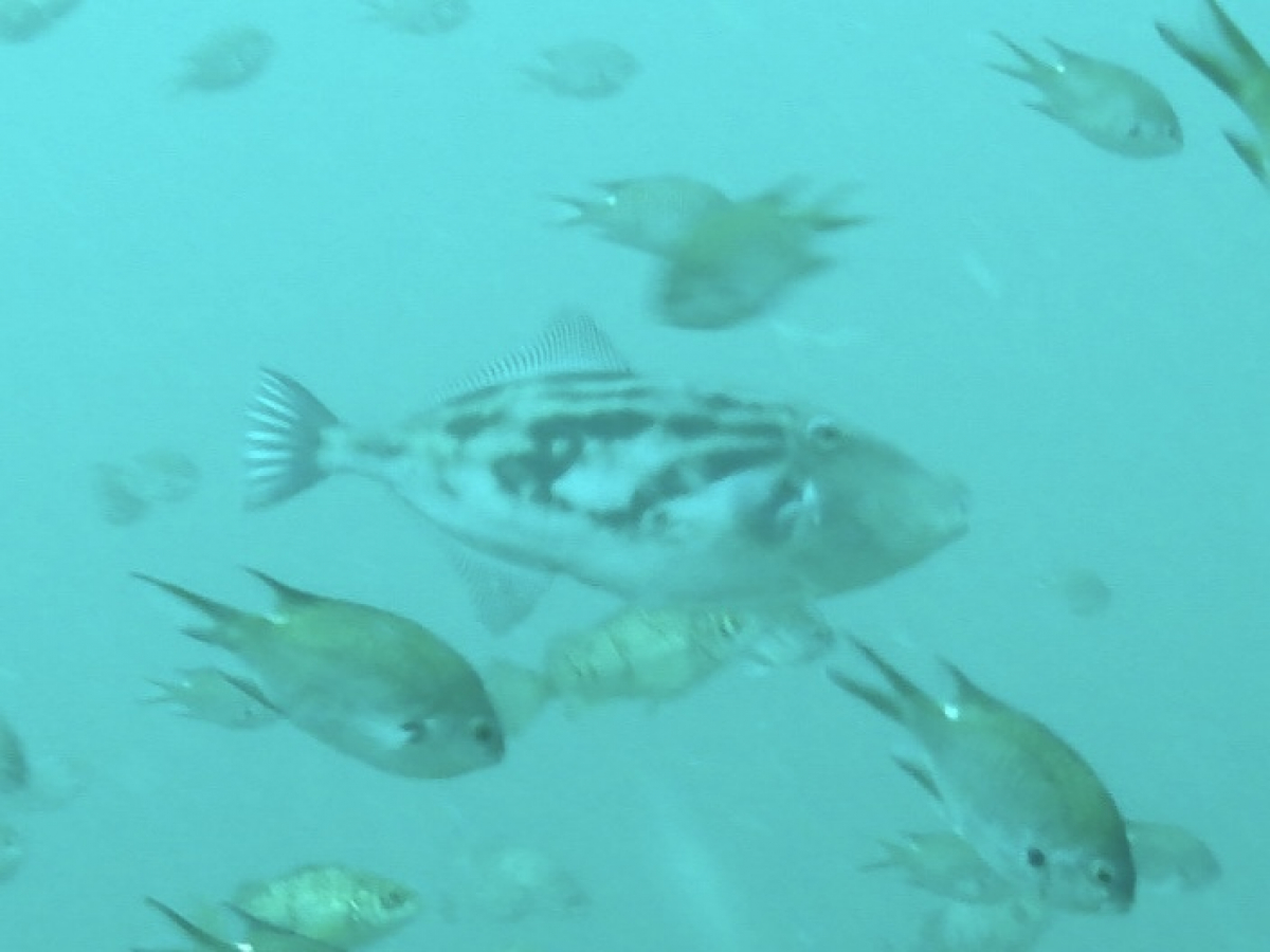 本種は,カワハギと比べて細長い形をしており,鰭が緑〜青色である。