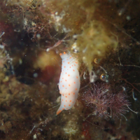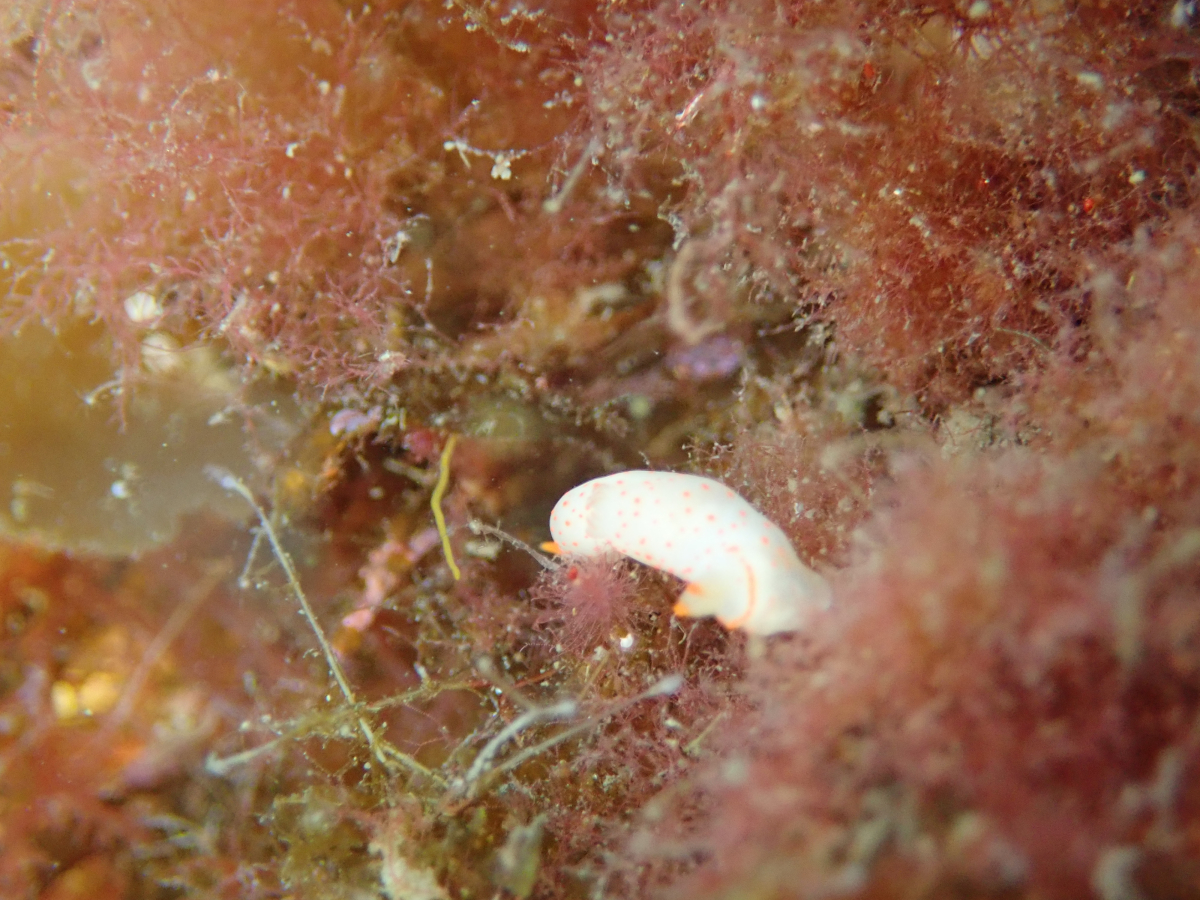 アカボシウミウシは、その名の通り体に赤い斑点が特徴的なウミウシです。体長は約2〜3cmで、色鮮やかな体色が水中でよく目立ちます。触角と鰓はオレンジ色で、背中には大きな白い斑点が点在しています。