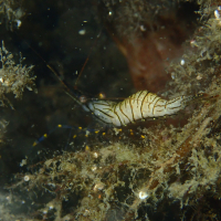イソスジエビは体長約3~4cmで、半透明な体に茶色の縞模様がある。腹部は細長く、脚の先端には小さな鋏がある。この縞模様は周囲の環境にカモフラージュ効果を持ち、生存に役立っている。