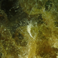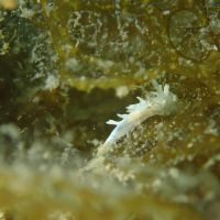 シロイバラウミウシは、白い体に繊細なイバラ状の突起が特徴です。通常、体長は約3センチメートルほどで、背中に広がる突起は機敏に動くことができます。触角も白く、小さくて目立ちにくいですが、ウミウシのデザインの一部として際立っています。体表は滑らかで、半透明の質感があります。