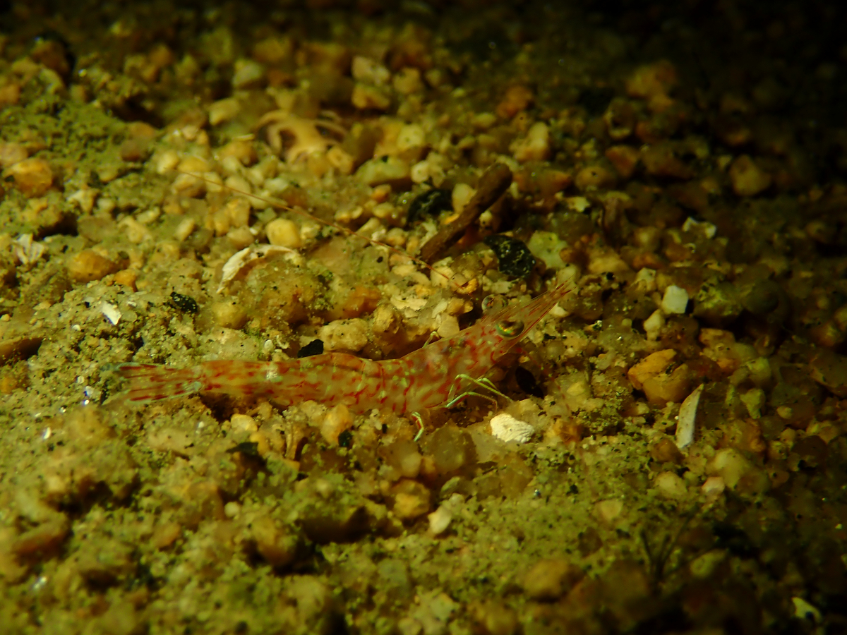 トラエビは中型から大型のエビで、その名前の通り、体には黒い縞模様があるのが特徴です。体色は全体としては透明感のある青色で、ベースに黄色みがかっています。また、尾の部分が扇状に広がっており、赤みを帯びた橙色をしています。