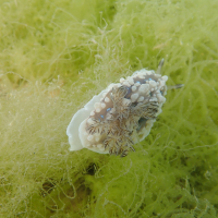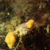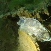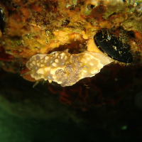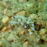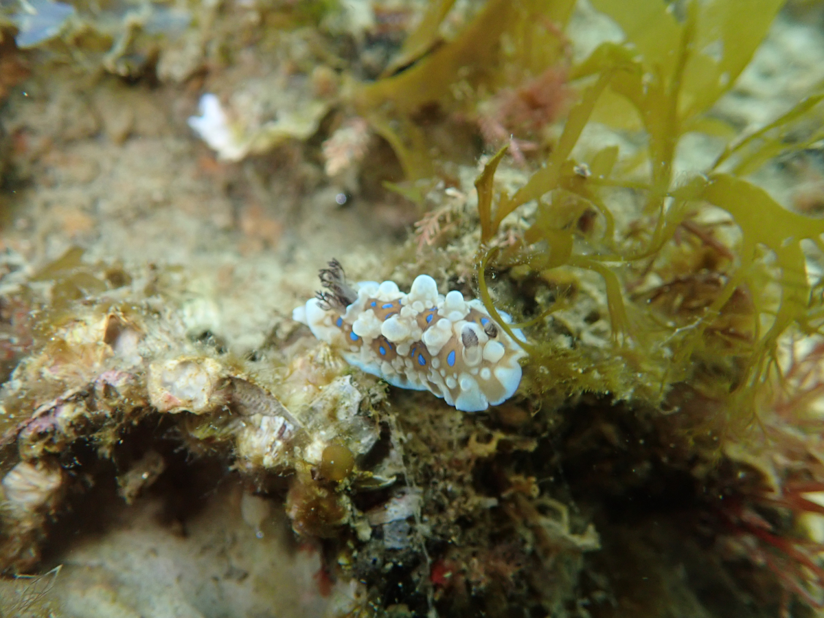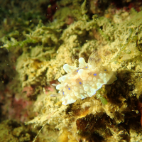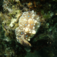 ミヤコウミウシは鮮やかな色合いと特徴的な体型で知られるウミウシの一種です。体長は通常5cmから10cmほどで、体表は滑らかで光沢があります。その体色は多様で、青、紫、ピンクなどの鮮やかな色を持ち、白い斑点や縁取りがあることが一般的です。また、背面に細かい突起があり、触角は短く太いのが特徴です。