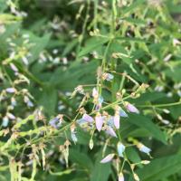 花は、7月~9月に咲き、紅紫色の蝶形花で翼弁が天狗の鼻のように長く突き出す。これは外来のヌスビトハギの仲間の特徴で、イリノイヌスビトハギ、アメリカヌスビトハギでも見られる。