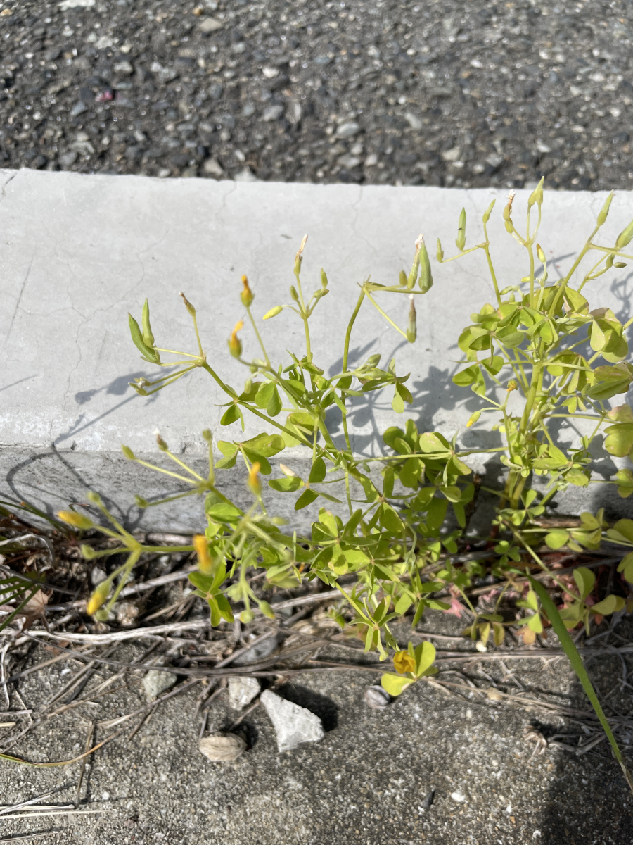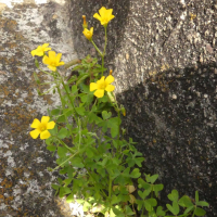 鮮やかな黄色の五弁花をつけ、葉や花はカタバミに似ているが茎が立ち上がるのが特徴。