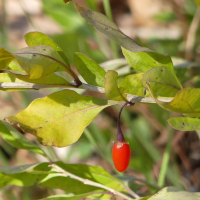 果実は液果で、長径1~2.5 cmほどの楕円形、秋の終わりから冬の始めにかけて赤く熟す。