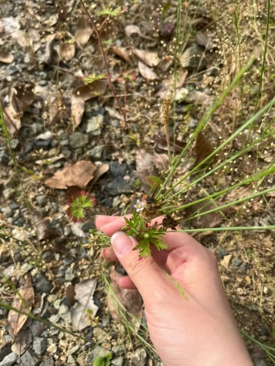 北アメリカ原産の越年草で、畑地、河川敷、道端などに生え、高さは10~40cmになる。 日本では昭和8年に京都で見つかったのが最初で、現在では日本全土に広く帰化している。 葉は大きく3~5裂し、それぞれの裂片はさらに分かれている。葉には長い柄があり、手のひらのような特徴的な形をしている。 花は4月~6月に咲き直径は5mm程度、淡いピンク色であるが濃いピンク色の花をつけるものもある。 葉は、赤く縁どられる傾向がある。