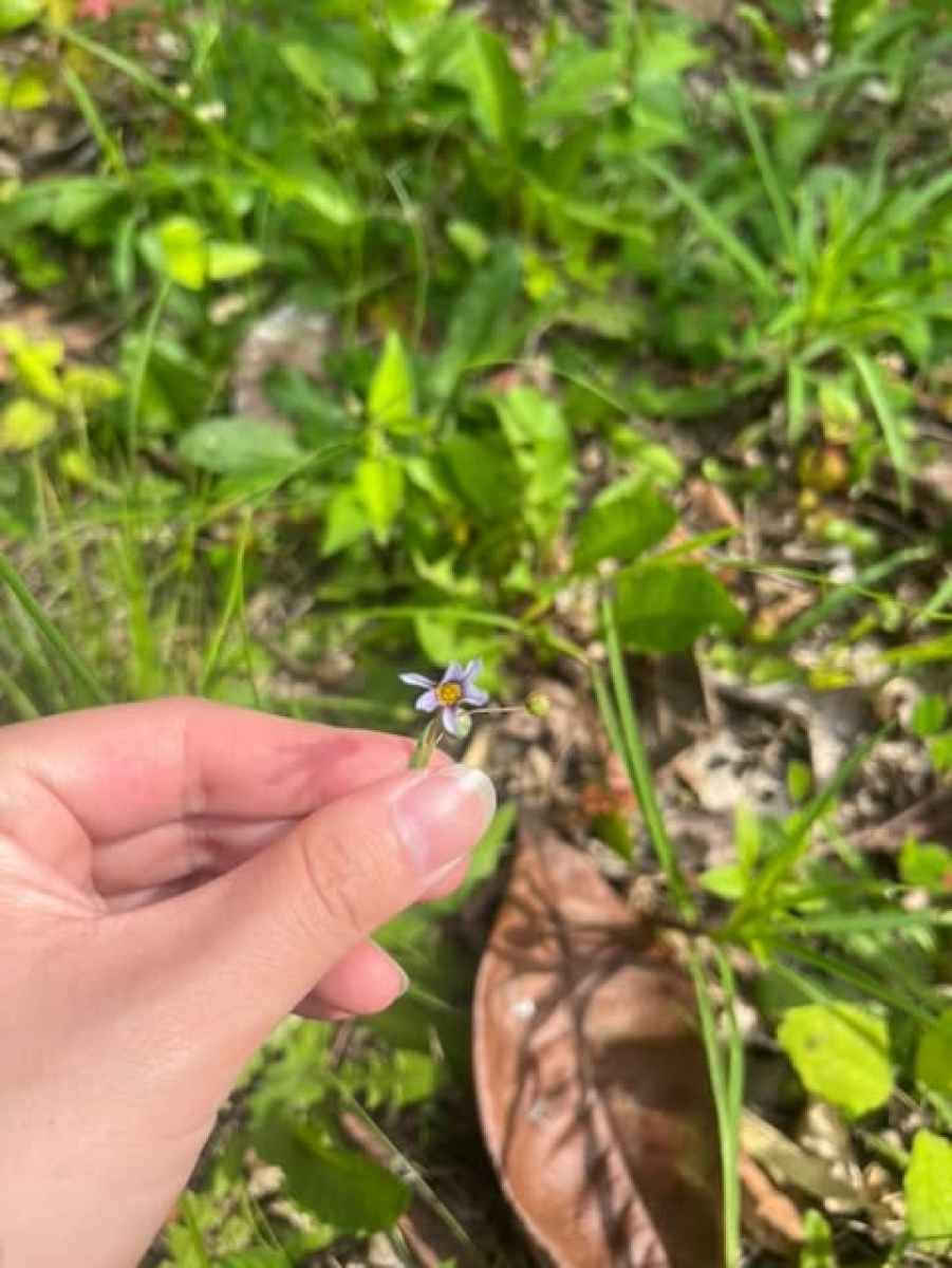 枝先に細い花柄をだして、直径約 1 cm ほどのニワゼキショウより小さい花をつける。花被片は6個、淡青紫色で紫色の筋があり、基部は黄色。花被片裏面の紫色の筋は目立たない。