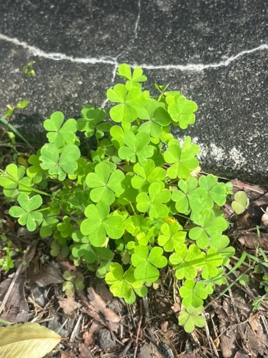 鮮やかな黄色の五弁花をつけ、葉や花はカタバミに似ているが茎が立ち上がるのが特徴。