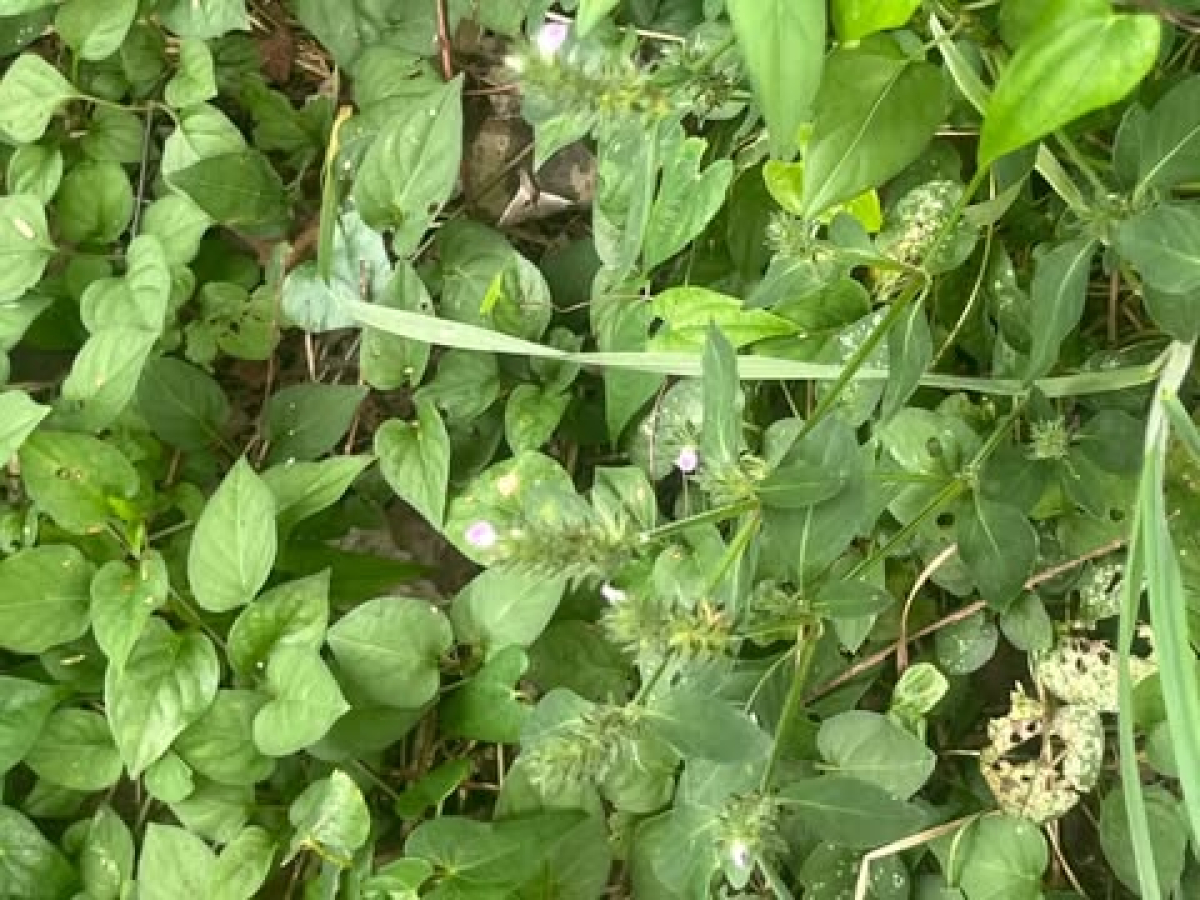 里山の林縁や道端に生える一年草。 夏に茎の先端から穂状の花序を出し、たくさんの花を密につけるが、花は一度に咲くことはなく、秋が深まるまでの長い期間、2・3個ずつ咲かせる。 花は唇花型で、上唇と下唇があり、下唇の拡がっている部分だけが赤紫色で、他は白い。
