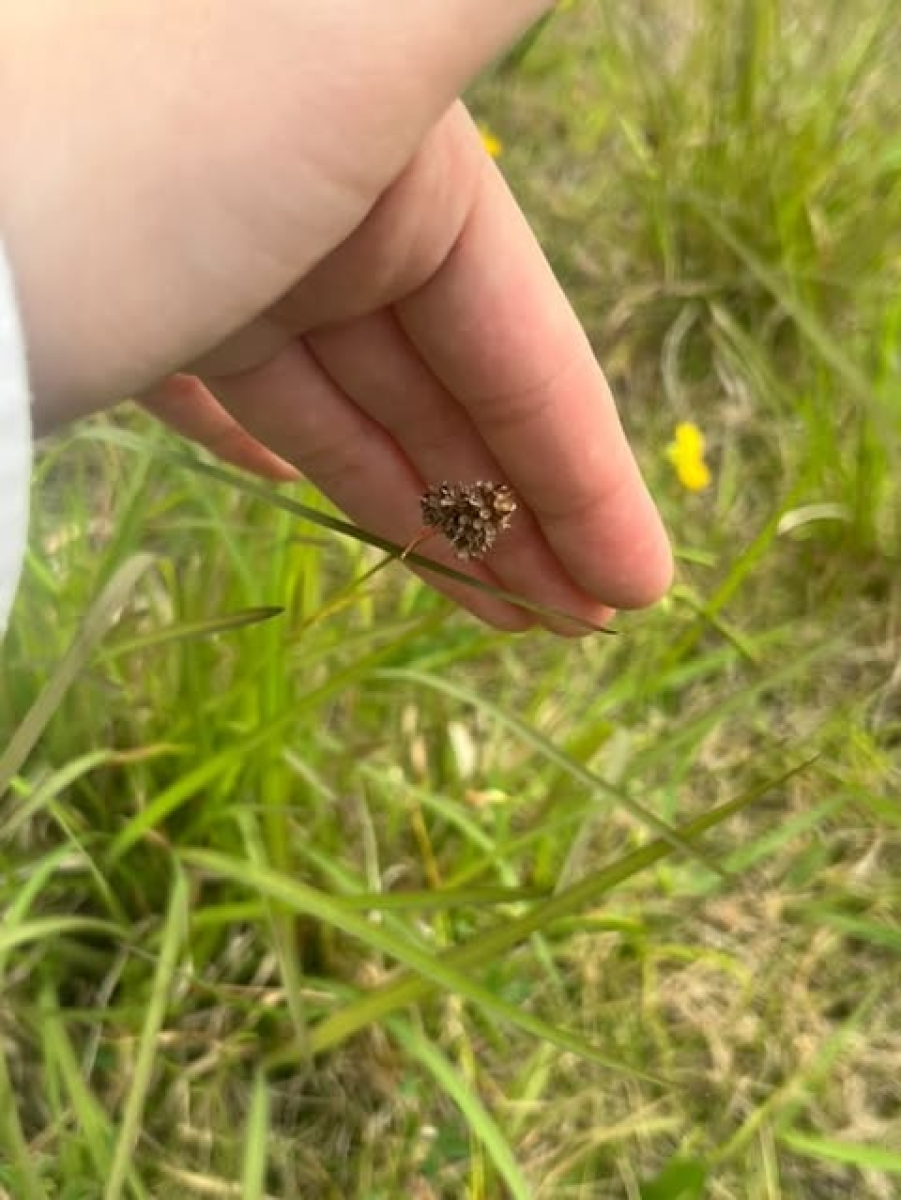 10cm位の細長い花茎の先端に花が頭状に集まる。見かけ上は個々の花ははっきりせず、赤褐色のくす玉のような固まりが着いているように見える。