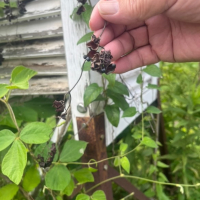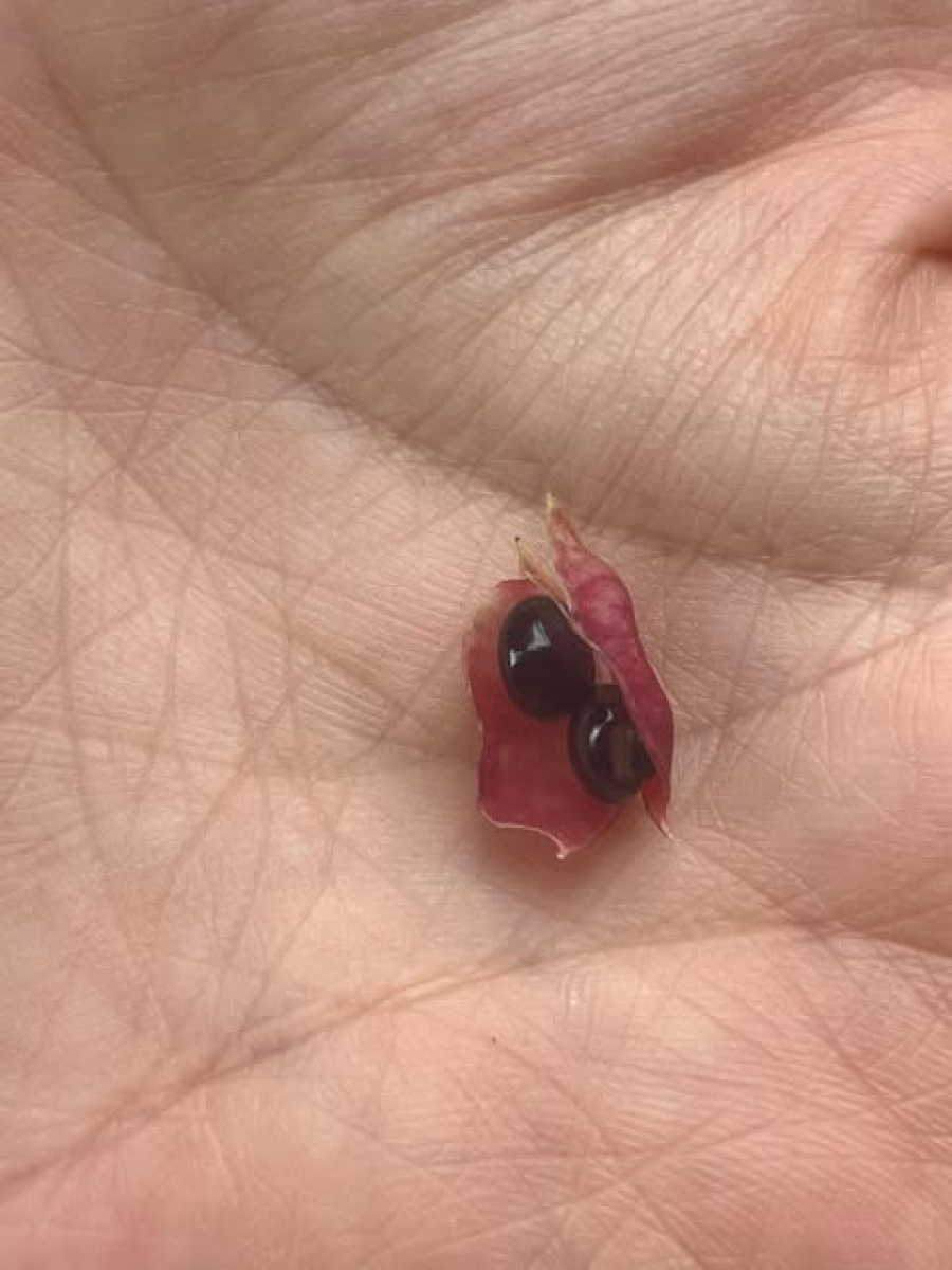 豆果は長さ約1.5㎝、熟すと果皮(さや)が赤くなり、開いて、2個の黒い種子が見える。種子は果皮についたままで、はじき飛ばない。