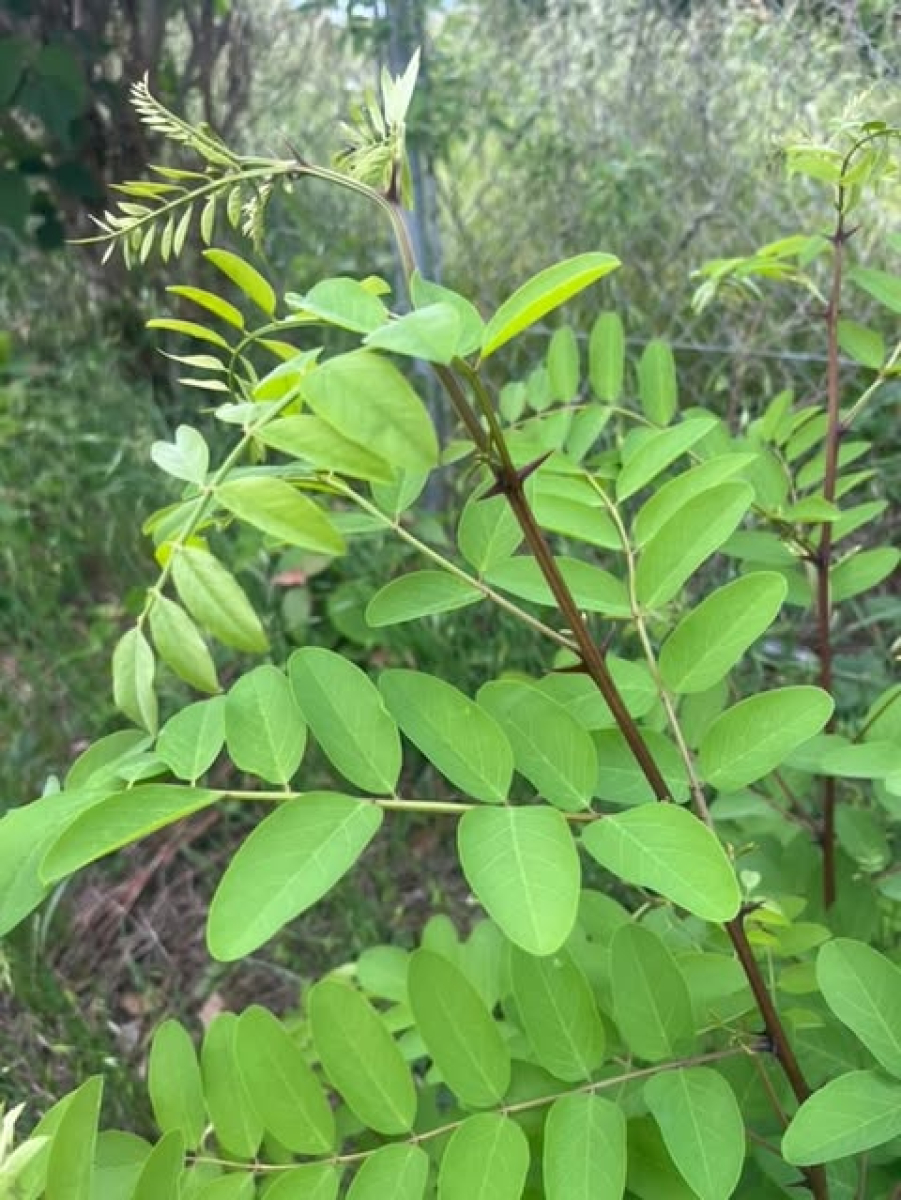 葉は、奇数羽状複葉で互生し、全体の長さは12~25cm。小葉は薄く3~11対あり、楕円形で長さ2~5 cm。葉柄の基部に1対の鋭いトゲ(托葉に由来)がある。
