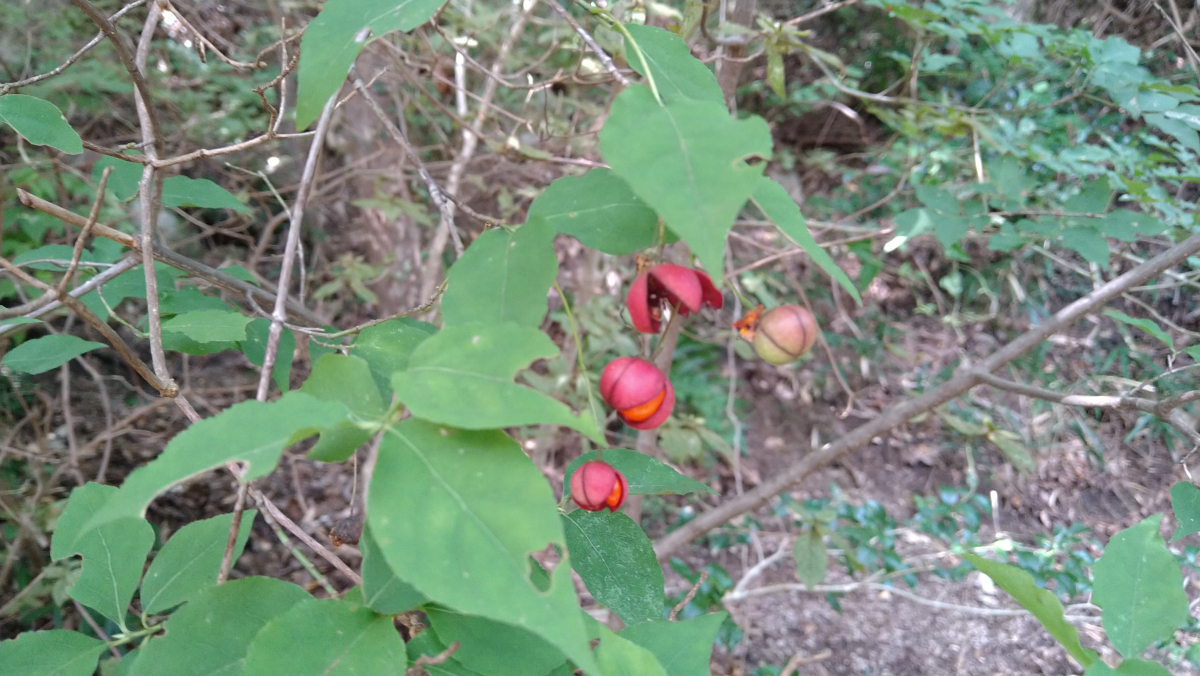 果実は10月~11月に熟し、4つに裂けて橙赤色の種子が顔を出した状態で枝からぶら下がる。