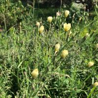茎の上部に直径約2cmの頭花を円錐状に多数つける。頭花はふつう淡黄色、まれに白色、淡紫色で、昼間開き、夕方にはしぼむ。