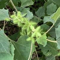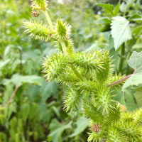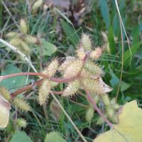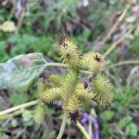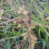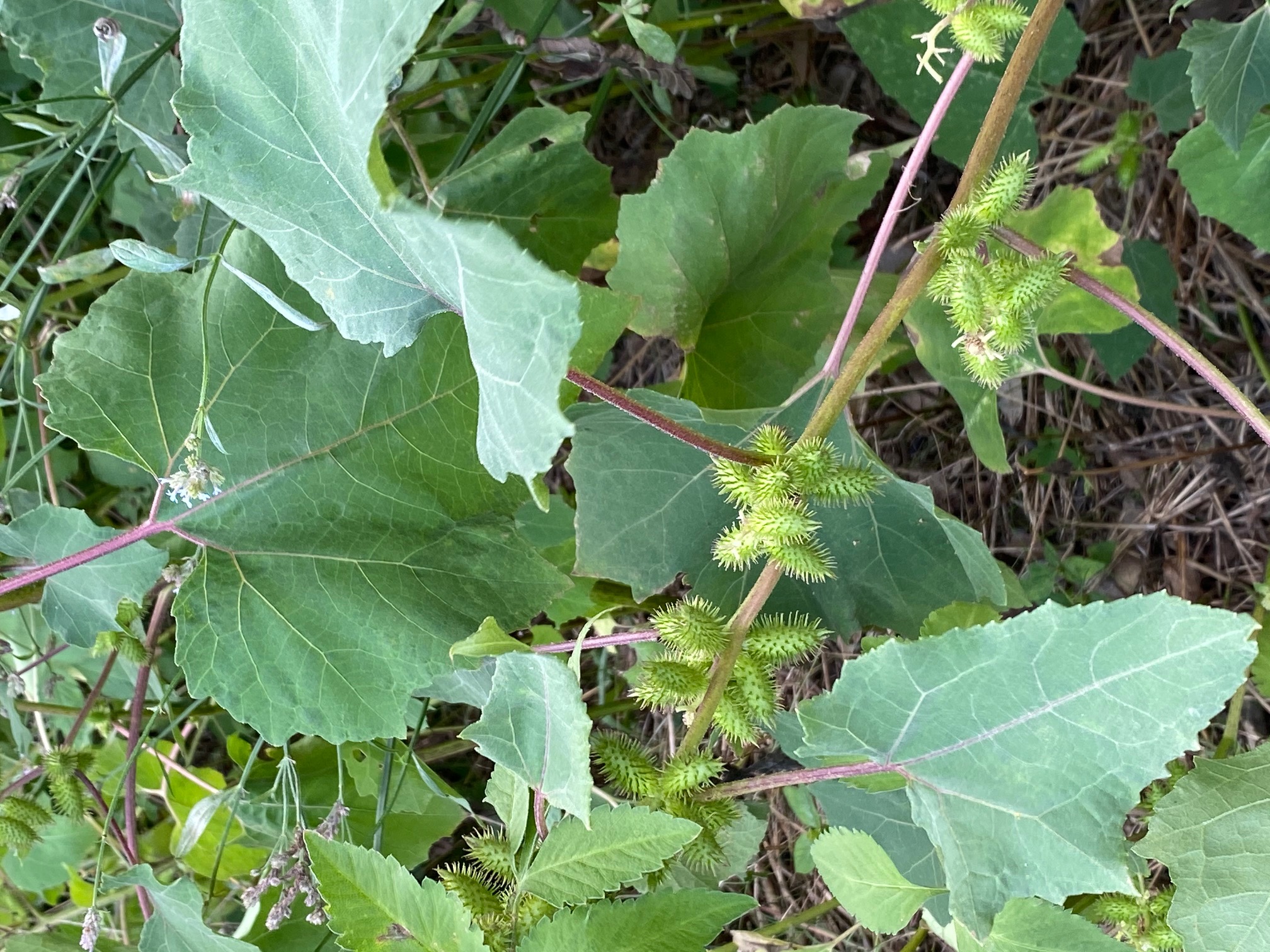 雌雄異花で、雄性の頭花は球形であり、茎の先端に集まってつく。一方、雌性の頭花は葉の付け根に小さく目立たずにつく。花粉が風で運ばれる風媒花で、雌花は受精するとトゲだらけの実を結び、この実は動物の毛に付いて運ばれる「ひっつき虫」となる。
