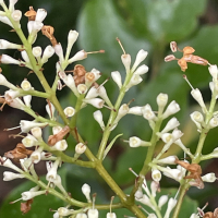 新しい枝先に花序を出して、白い小花を円錐状に多数咲かせて目立つ。枝先につく花序は円錐形で特有の異臭があり、長さ5~12 cm。花は筒状で、径5~6 mm、花冠は白く、中程まで四つに割れ、それぞれが反り返る。