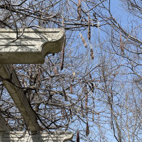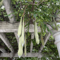 花が終わると大型の豆果が垂れ下がる。豆果(さや)は長さ10~30 cm、幅2~2.5 cmあり、表面にはビロード状の短い毛を密生する。